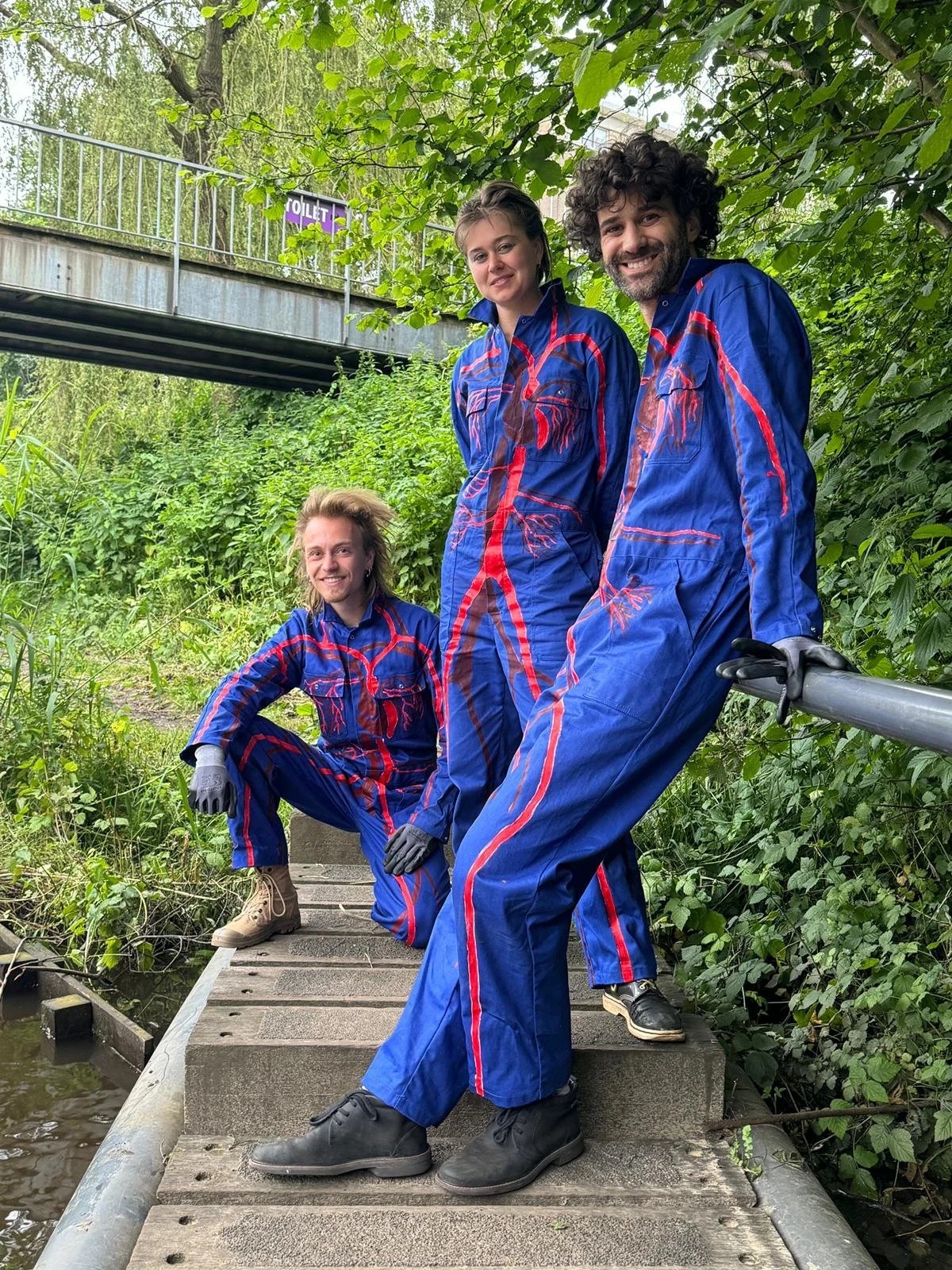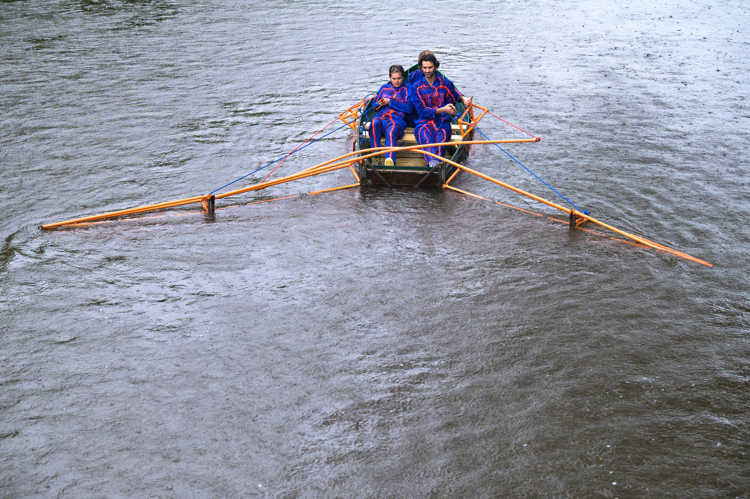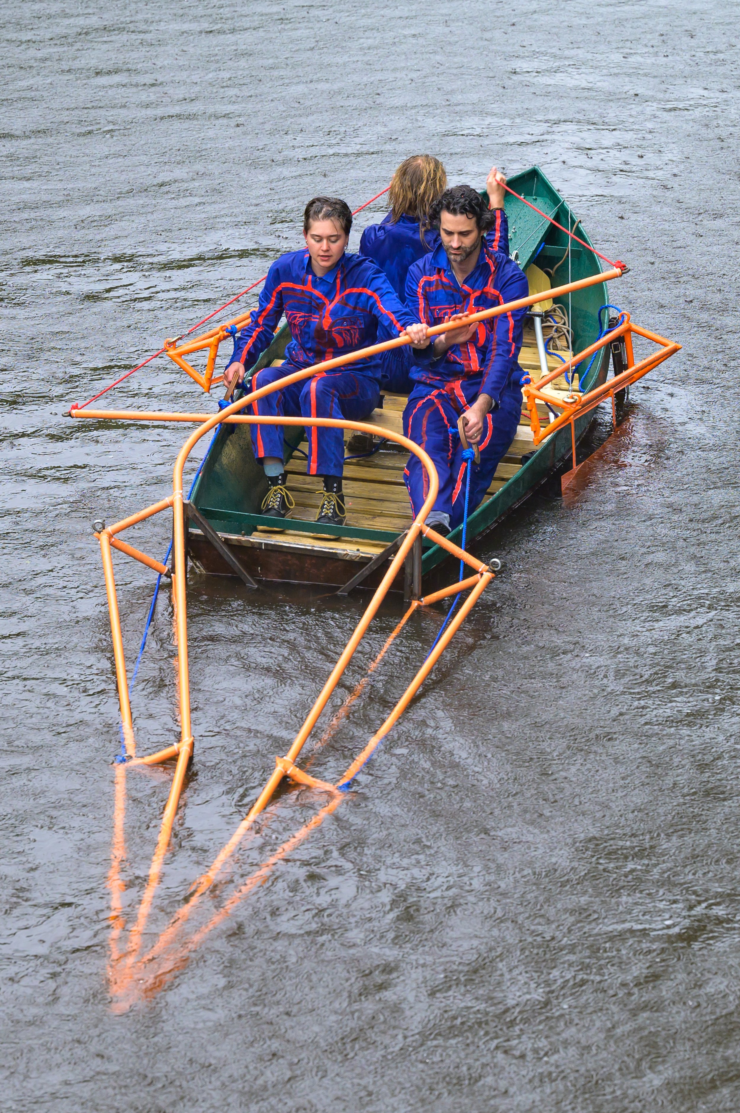 Made for the BoschParade 2023. By pulling on the ropes the legs of the boat will move. This mechanical system is the motor of the boat and representates the breaststroke. Costumes made by Lesse Melijn are painted with organs and vains. The ropes of the boat are an extension of our body.