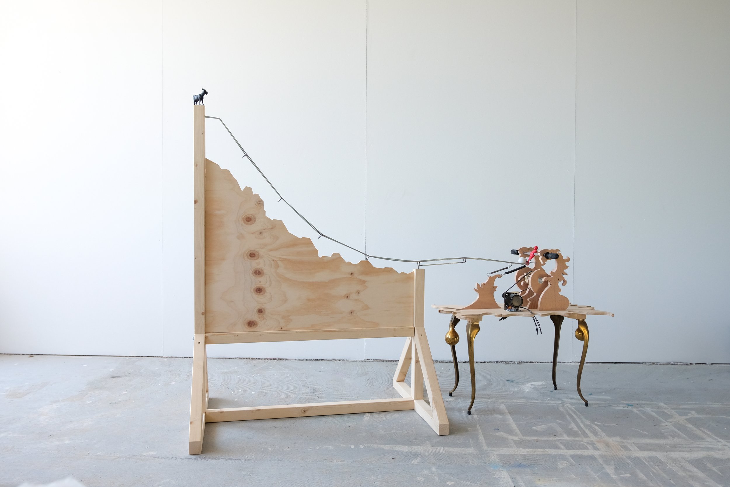 Wood, metal, found objects, motor, mechanical parts.